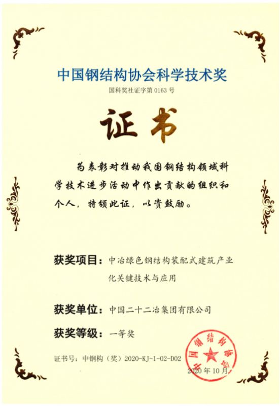 中國(guó)二十二冶集團(tuán)有限公司設(shè)計(jì)院喜獲中國(guó)鋼結(jié)構(gòu)協(xié)會(huì)科學(xué)技術(shù)獎(jiǎng)一等獎(jiǎng)